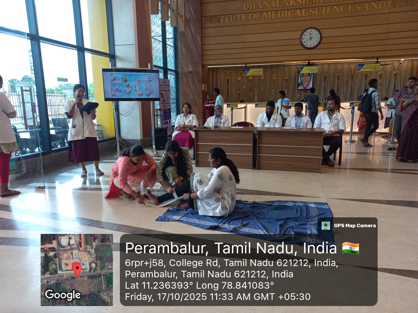 Dhanalakshmi Srinivasan University, School of Allied Health Sciences Perambalur, organized the Malaria Awareness Program and Camp on April 25. The program combined instructional sessions and camp on kurumbaloor Village primary health centre with practical health interventions to successfully combat malaria. The initiative featured thorough workshops delivered by healthcare professionals that covered malaria prevention techniques, symptom recognition, and treatment choices. Concurrently, a screening camp provided community members with diagnostic testing and counselling, with an emphasis on early diagnosis and treatment. The delivery of mosquito nets, insect repellents, and educational materials supplemented the awareness campaign, creating community empowerment in malaria control. The event successfully engaged participants in proactive health behaviors, emphasizing the need of working together to reduce malaria incidence and promote community well-being.