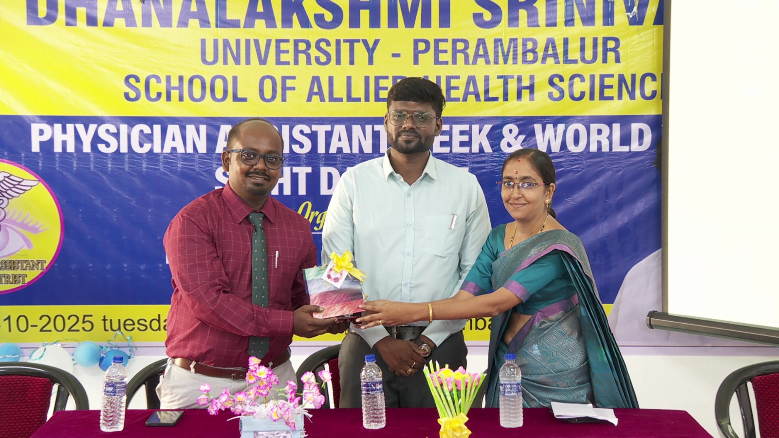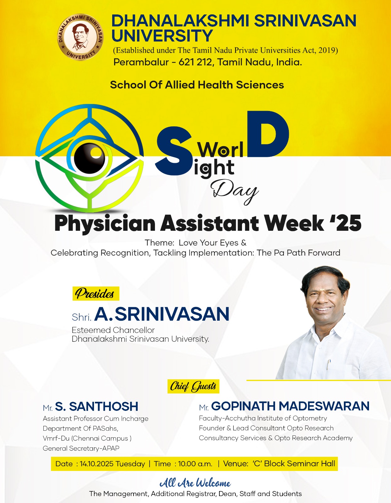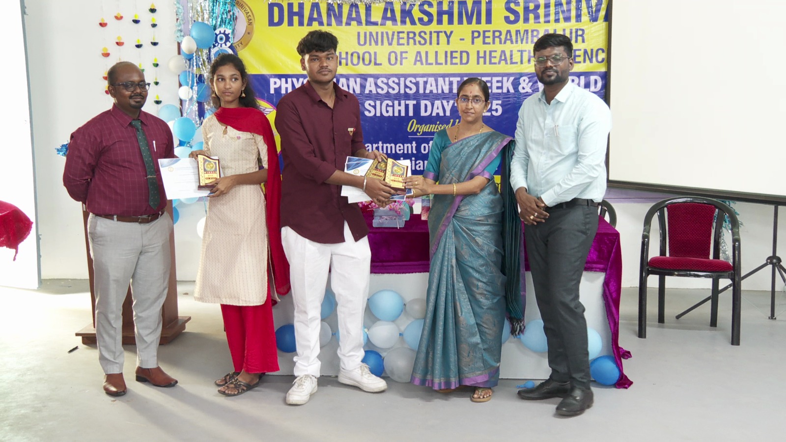 The School of Allied Health Sciences, Dhanalakshmi Srinivasan University, celebrated Physician Assistant Week and World Sight Day on 13th & 14th October 2025 with a variety of academic and cultural activities. Students actively participated in competitions such as poster presentations, quiz programs, and vegetable carvings based on anatomy and disease diagnosis. On 14th October, a guest lecture on Role of PA and Current Updates in Physician Assistant Profession was delivered by Mr. Santhosh, Assistant Professor, Vinayaka Mission, Chennai, and General Secretary of the Physician Assistant Association of India. For Optometry, a special lecture on Low Vision Assessment in Field Defects was presented by Dr. Gopinath, Research Associate, Achytha Eye Care & Optometry Institute, Erode, and member of the Tamil Nadu Optometry Association. The celebrations concluded with the distribution of prizes and certificates to the winners, marking an inspiring and insightful event that enriched the knowledge and skills of Allied Health Sciences students.