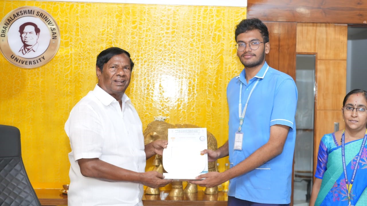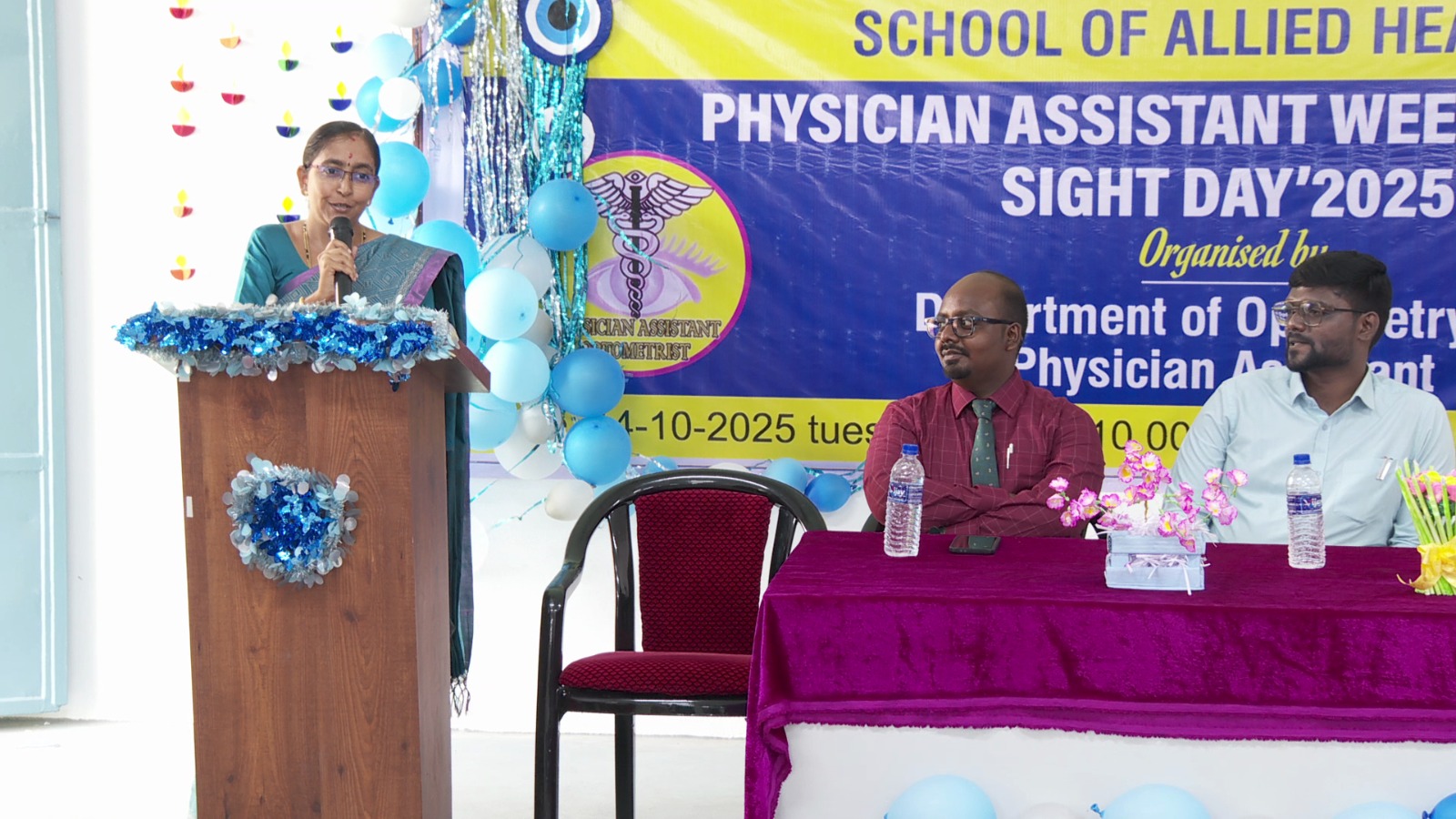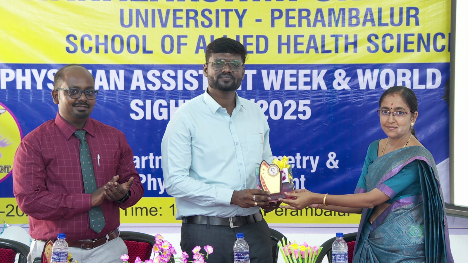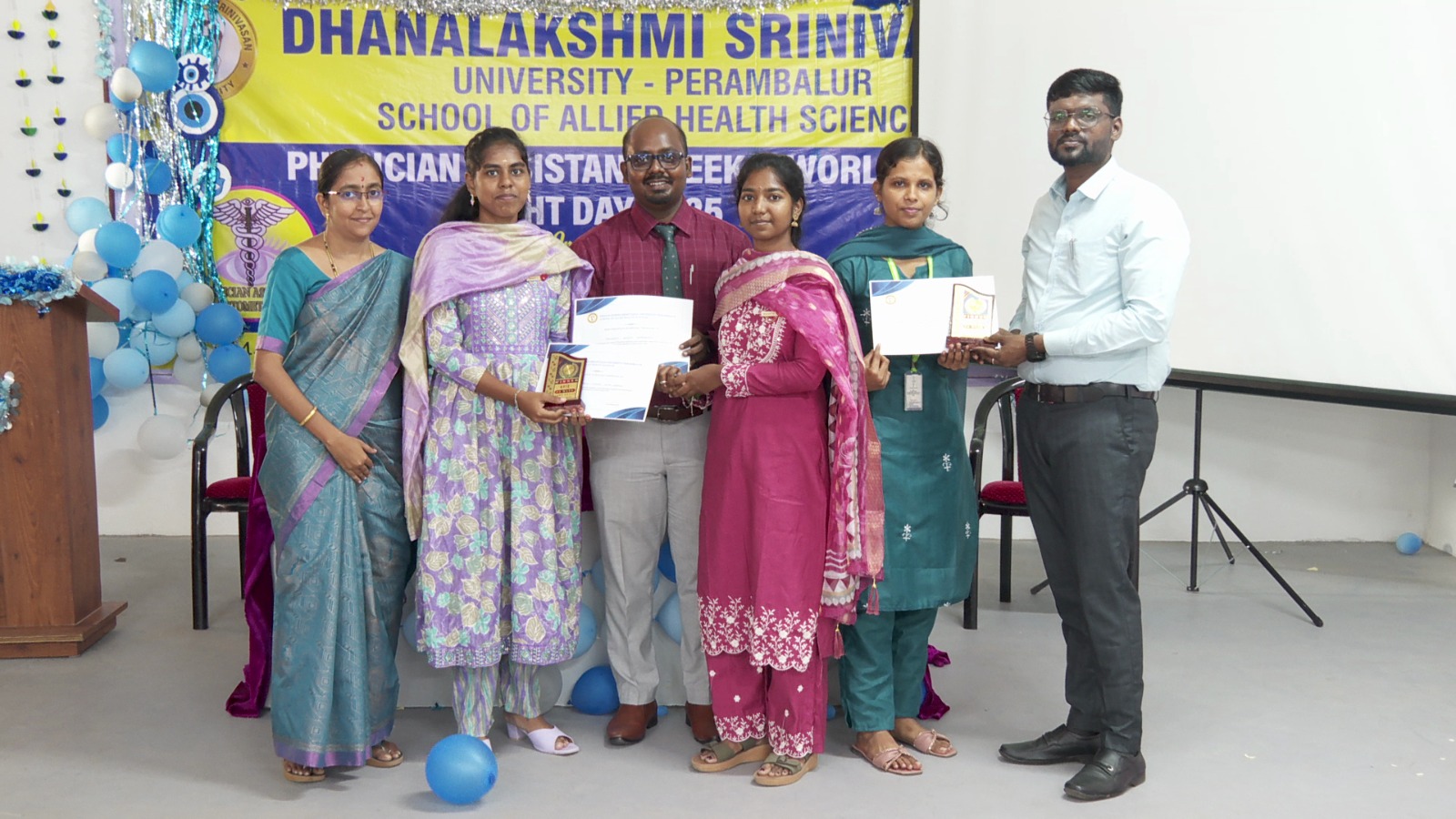 The School of Allied Health Sciences, Dhanalakshmi Srinivasan University, celebrated Physician Assistant Week and World Sight Day on 13th & 14th October 2025 with a variety of academic and cultural activities. Students actively participated in competitions such as poster presentations, quiz programs, and vegetable carvings based on anatomy and disease diagnosis. On 14th October, a guest lecture on Role of PA and Current Updates in Physician Assistant Profession was delivered by Mr. Santhosh, Assistant Professor, Vinayaka Mission, Chennai, and General Secretary of the Physician Assistant Association of India. For Optometry, a special lecture on Low Vision Assessment in Field Defects was presented by Dr. Gopinath, Research Associate, Achytha Eye Care & Optometry Institute, Erode, and member of the Tamil Nadu Optometry Association. The celebrations concluded with the distribution of prizes and certificates to the winners, marking an inspiring and insightful event that enriched the knowledge and skills of Allied Health Sciences students.