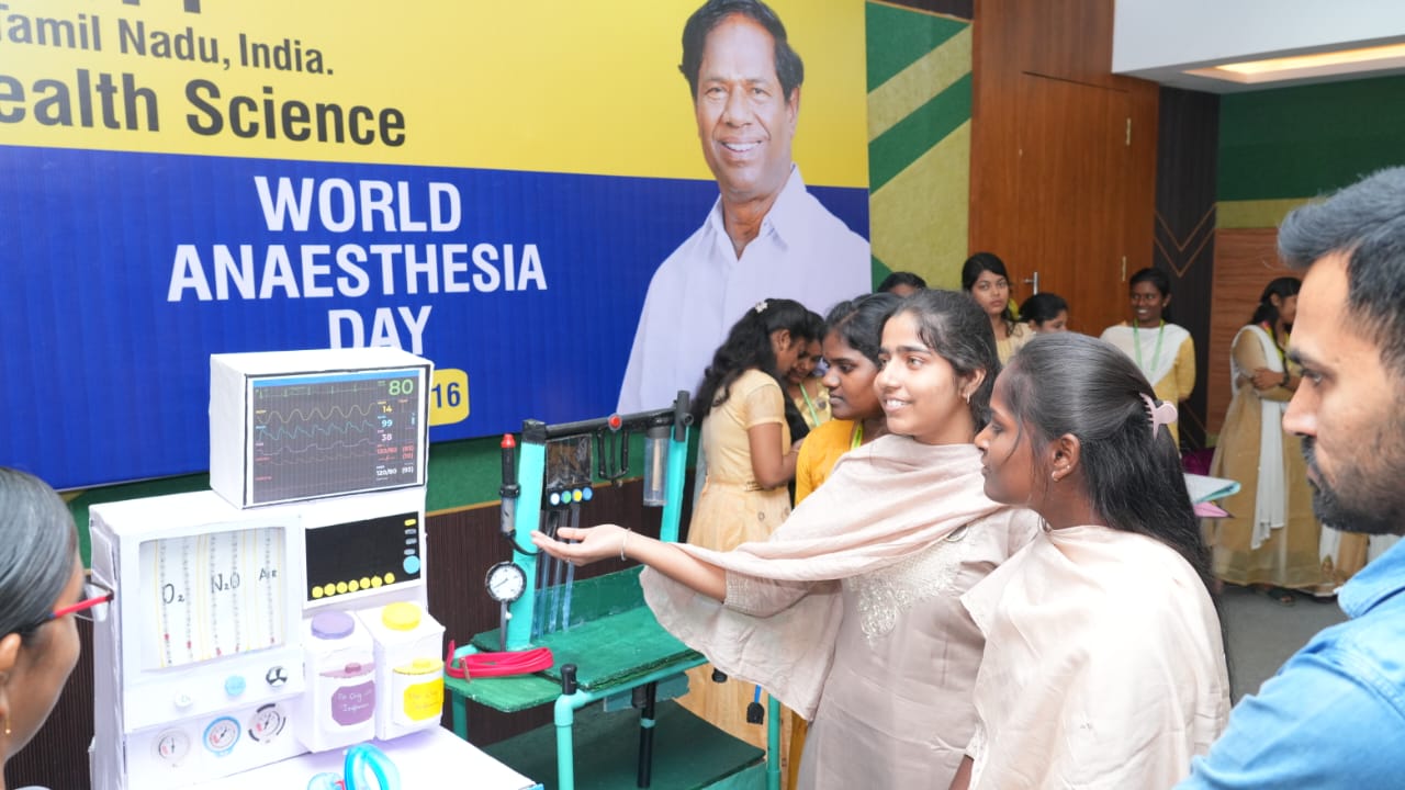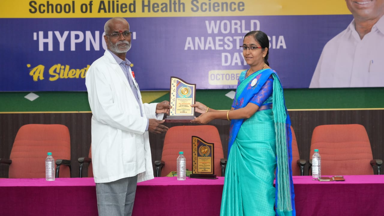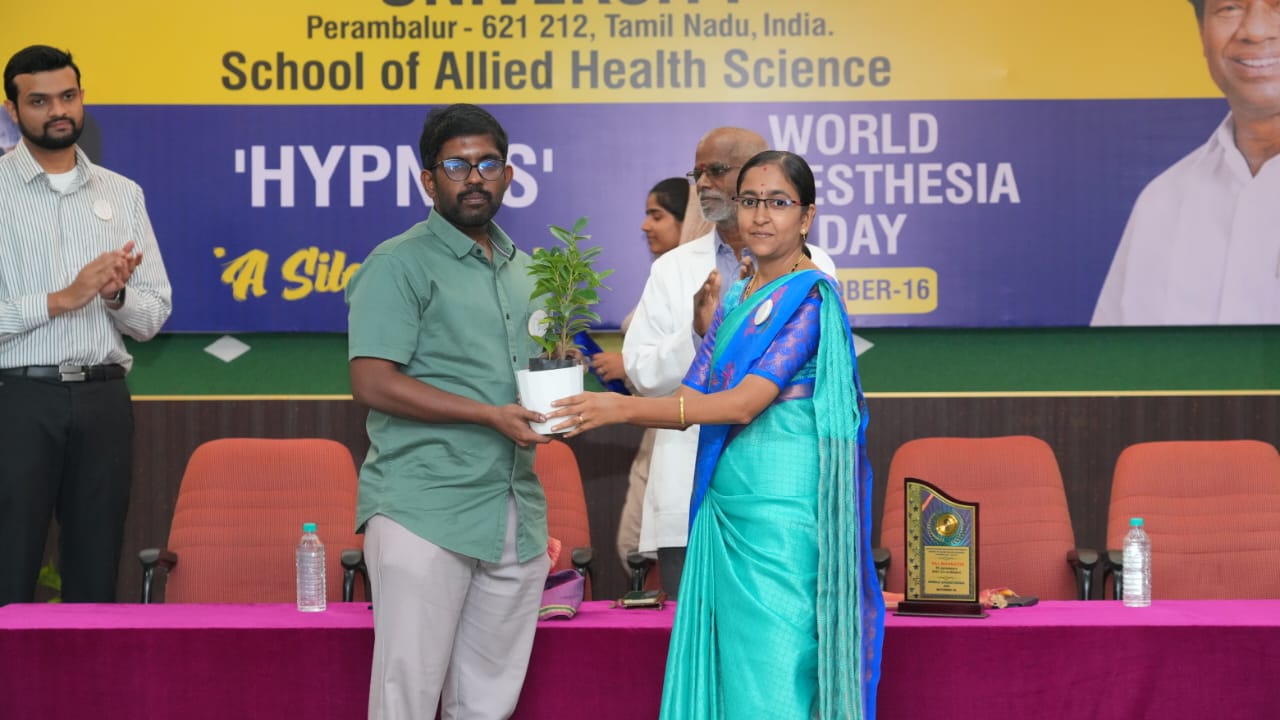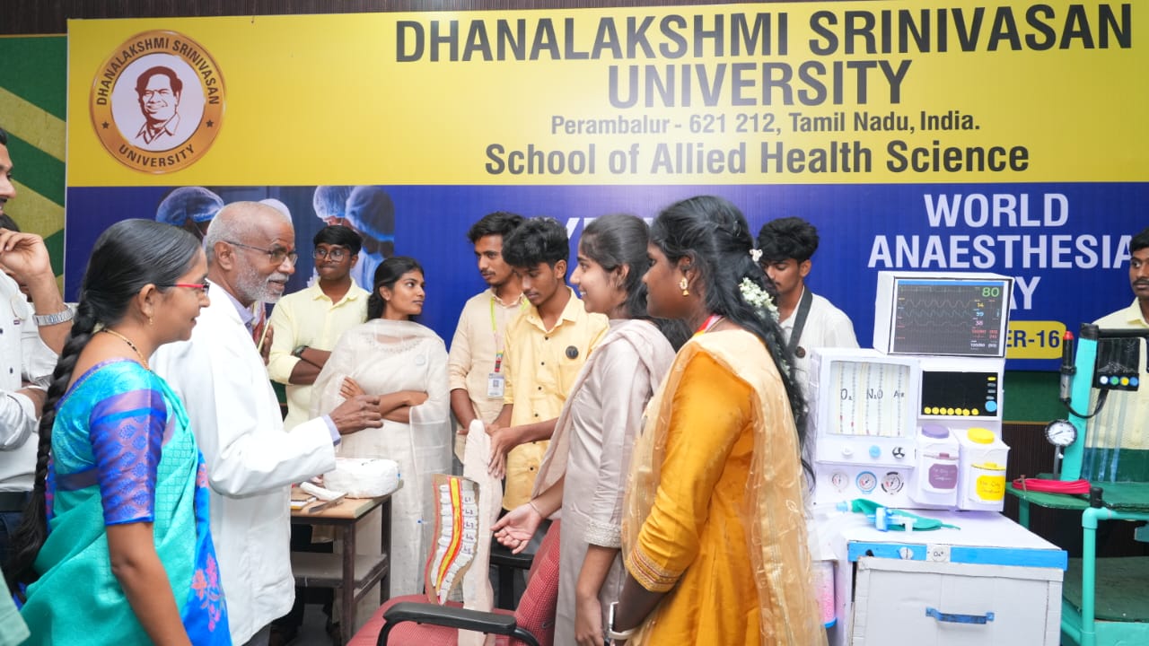 Dhanalakshmi Srinivasan university’s school of allied health sciences celebrated “WORLD ANESTHESIA DAY” on October 16, 2024 under the presidency of Shri. A. Srinivasan. The event was graced by esteemed guests, Dr. Visvanathan MD., (dean), Dr. T. Jeyaseelan senthinath MD.,(Deputy Medical Superindent) and Dr. G. Siva MBBS., (ARMO). The keynote lecture on “endotracheal intubation” was delivered by Dr. N. Nivedha. To make the celebration more engaging and informative various competitions were organized including quiz, poster presentation, drawing, poetry (Kavithai) and Reel making. Our students actively participated in the competitions and showcased their creativity and enthusiasm.
