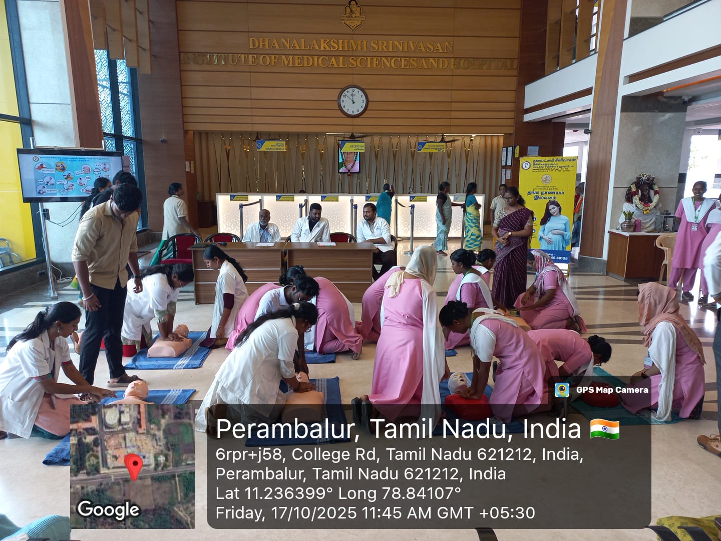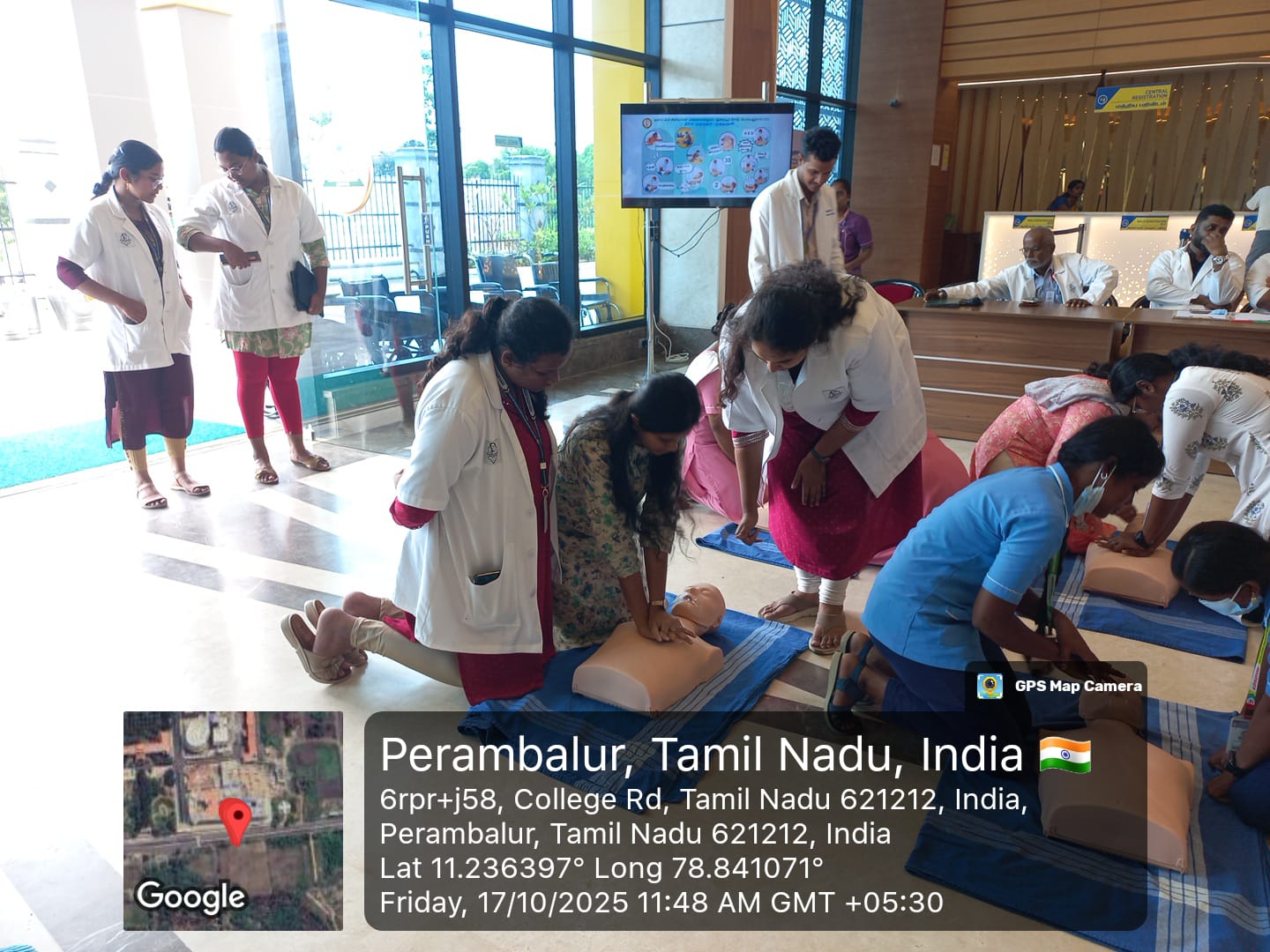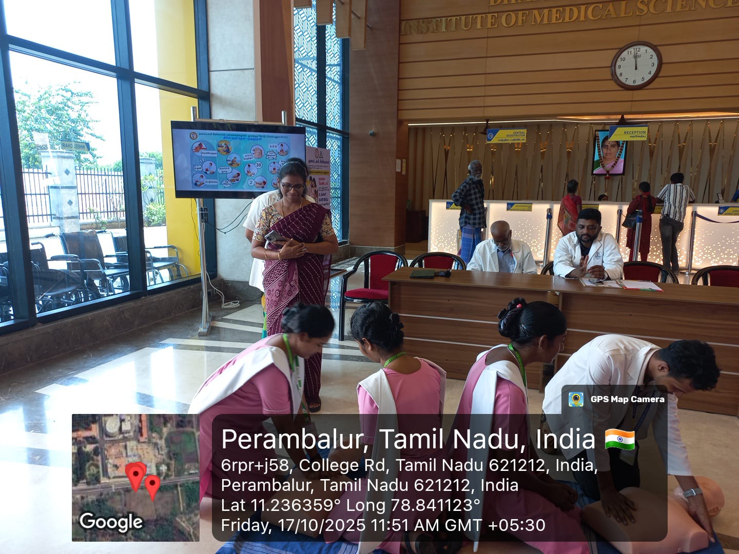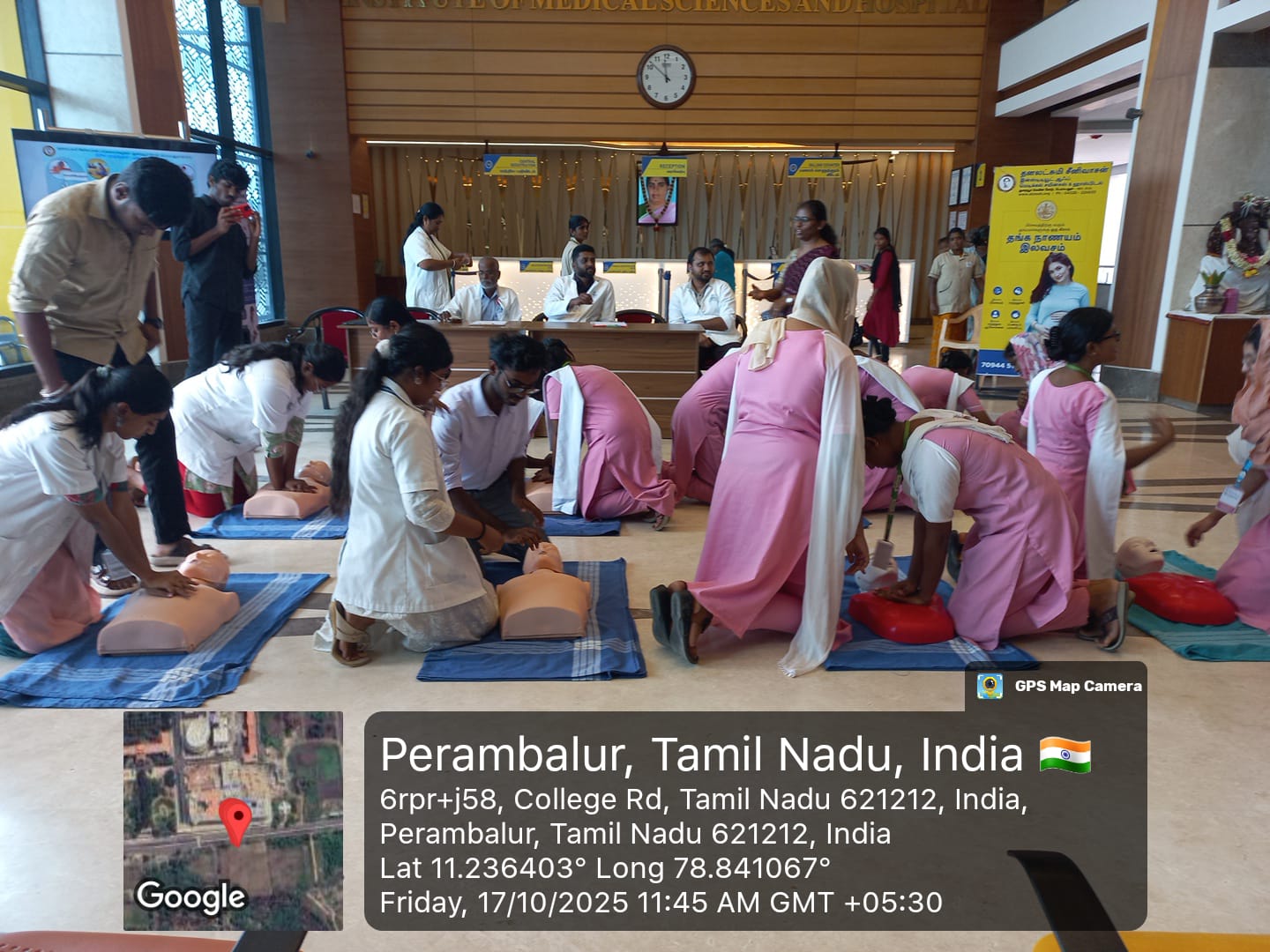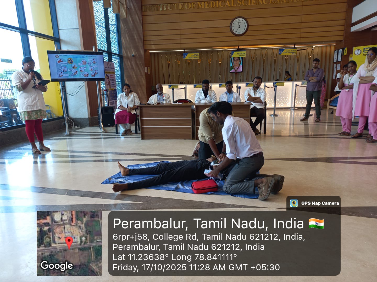 The School of Allied Health Sciences observed CPR Awareness Week - October 2025 with a series of activities aimed at educating the public and students on life-saving techniques during cardiac emergencies. Mass Demonstration on CPR Technique: As part of the Mass Gathering Preparedness Initiative, Dr. Paramasivan (Head of Anesthesia) and Dr. Vasanth (Assistant Professor, Emergency Medicine) along with their team members Dr. Sandiya, Dr. Jothiswaran, Mr. Manikandan and CCT Third Year students (Ms. Ayisha, Ms. Dharani, Mr. Kanitharan, Ms. Renuka, Ms. Rohini, Ms. Sathyabama) conducted a live demonstration on Cardiopulmonary Resuscitation (CPR). The session educated participants on the essential steps of CPR and stressed the importance of timely intervention. Street Play - Be a Lifesaver, Not a Bystander A street play was performed to highlight the importance of responding quickly during cardiac arrest. The performance emphasized how every individual has the potential to save lives with basic CPR knowledge and quick action. Poster Competition: Students of SIMS presented both e-posters and paper posters on CPR covering the concept, techniques for adults, infants and pregnant women, and the proper use of Automated External Defibrillators (AED). The posters served to create awareness on the importance of CPR in saving lives. Quiz Competition: A quiz competition was conducted for students on life-saving techniques. It included topics such as fundamentals of CPR, techniques for different age groups and conditions, and AED usage. The activity encouraged active participation and reinforced the importance of being prepared for cardiac emergencies. The CPR Awareness Week 2025 successfully enhanced knowledge, awareness, and preparedness among both students and the general public with the message - Every Second Counts - Be a Lifesaver.