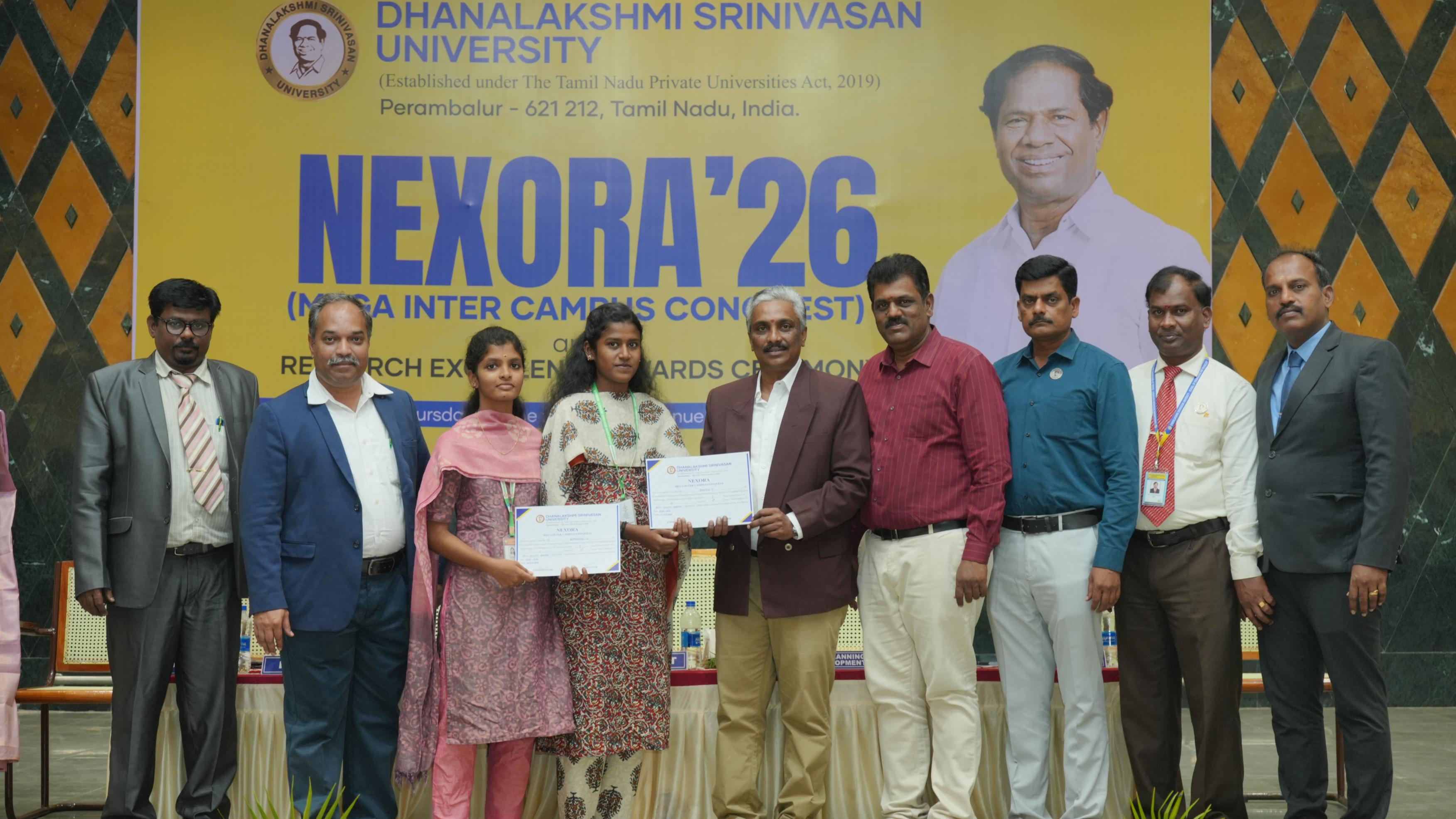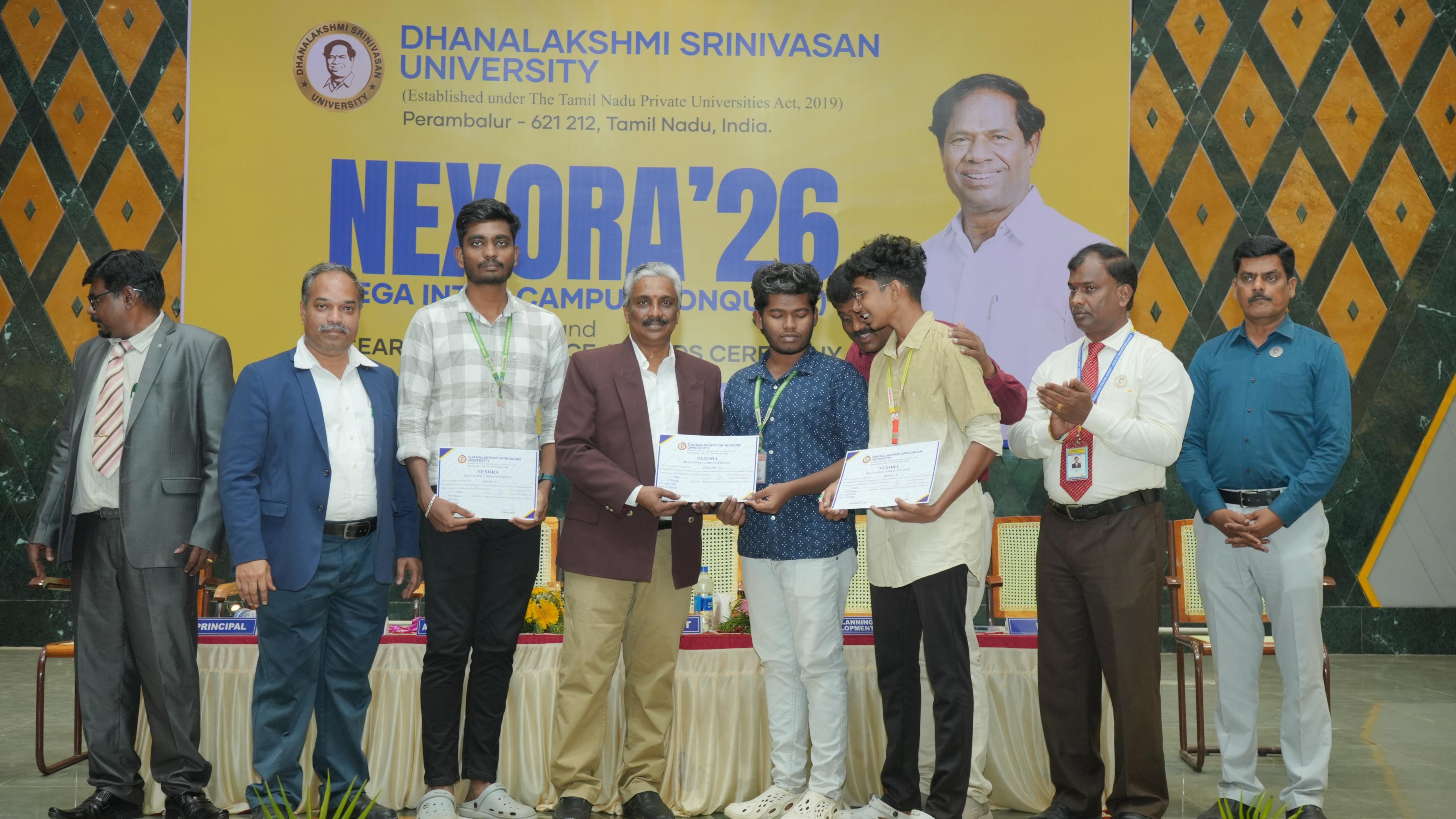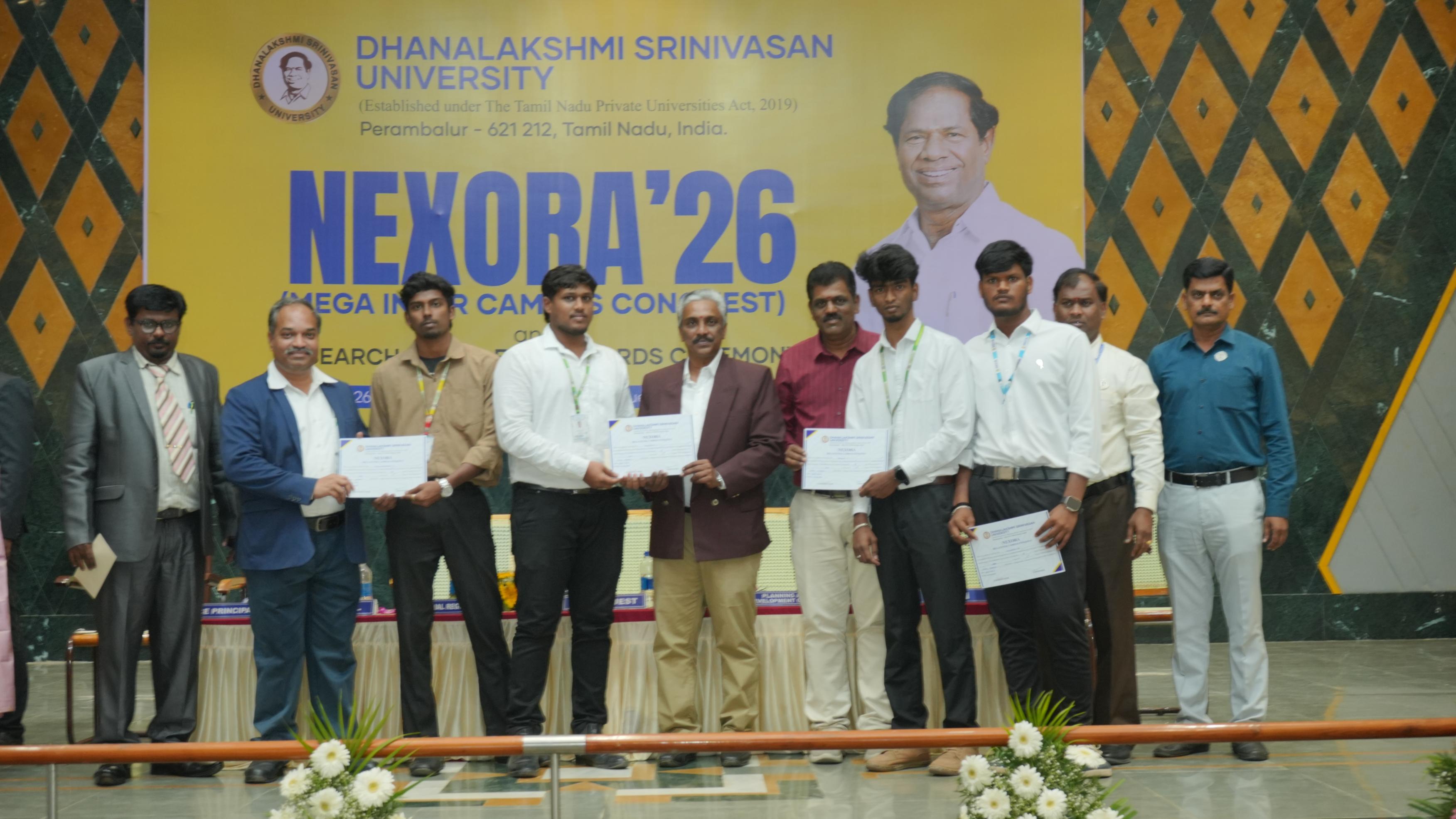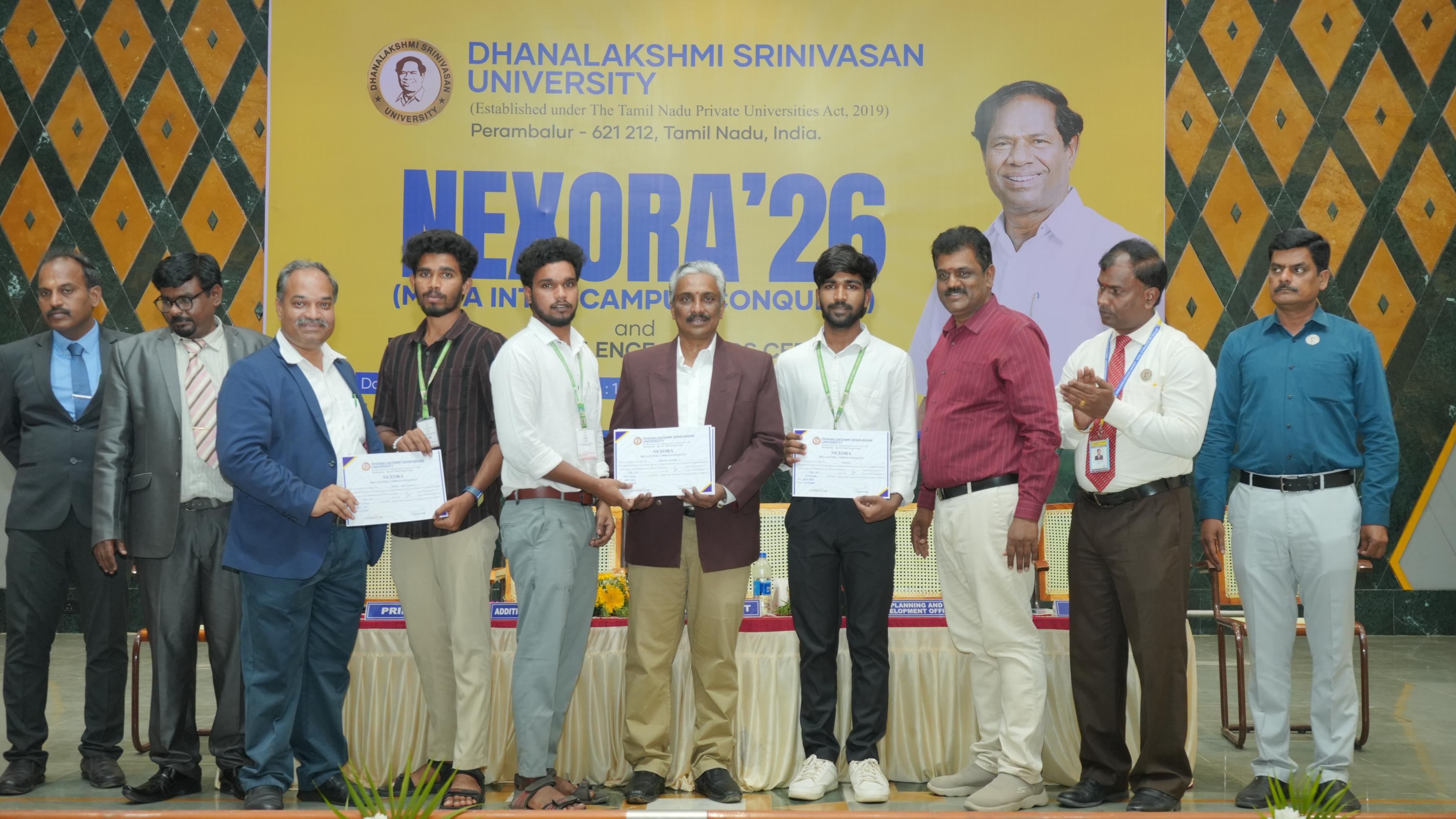 Helpline : +91 63841 76766 | 63841 76769The School of Engineering & Technology, Dhanalakshmi Srinivasan University, Perambalur, successfully organized “NEXORA – Beyond Boundaries” on 28th February 2026. The event aimed to bring together students from various institutions to showcase their talents, creativity, and technical skills through a vibrant inter-campus platform. The programme emphasized the importance of holistic development by encouraging students to participate in both cultural and technical activities. NEXORA featured a wide range of competitions under categories such as Zest, Litaura, Tech Fest, Kalautsav, and Proto Fest, covering areas like innovation, coding, arts, communication, and performance. The event witnessed active participation from students across different colleges, creating an energetic and competitive atmosphere. Participants demonstrated exceptional talent, teamwork, and creativity throughout the competitions. NEXORA 2026 concluded successfully with a prize distribution ceremony, recognizing outstanding performers and appreciating the efforts of all participants. The event truly reflected its theme, “Beyond Boundaries,” by inspiring students to explore their potential beyond academics.