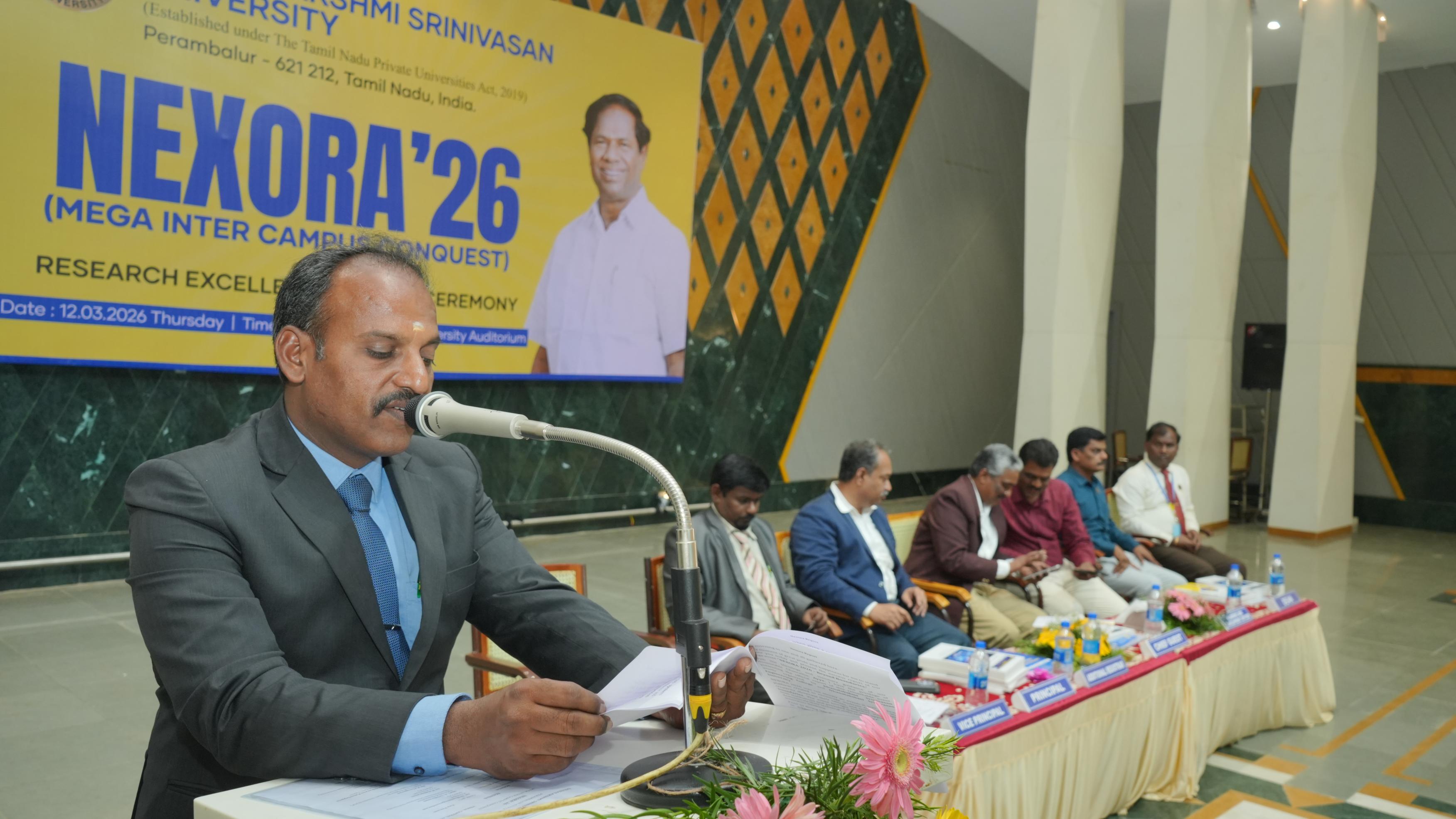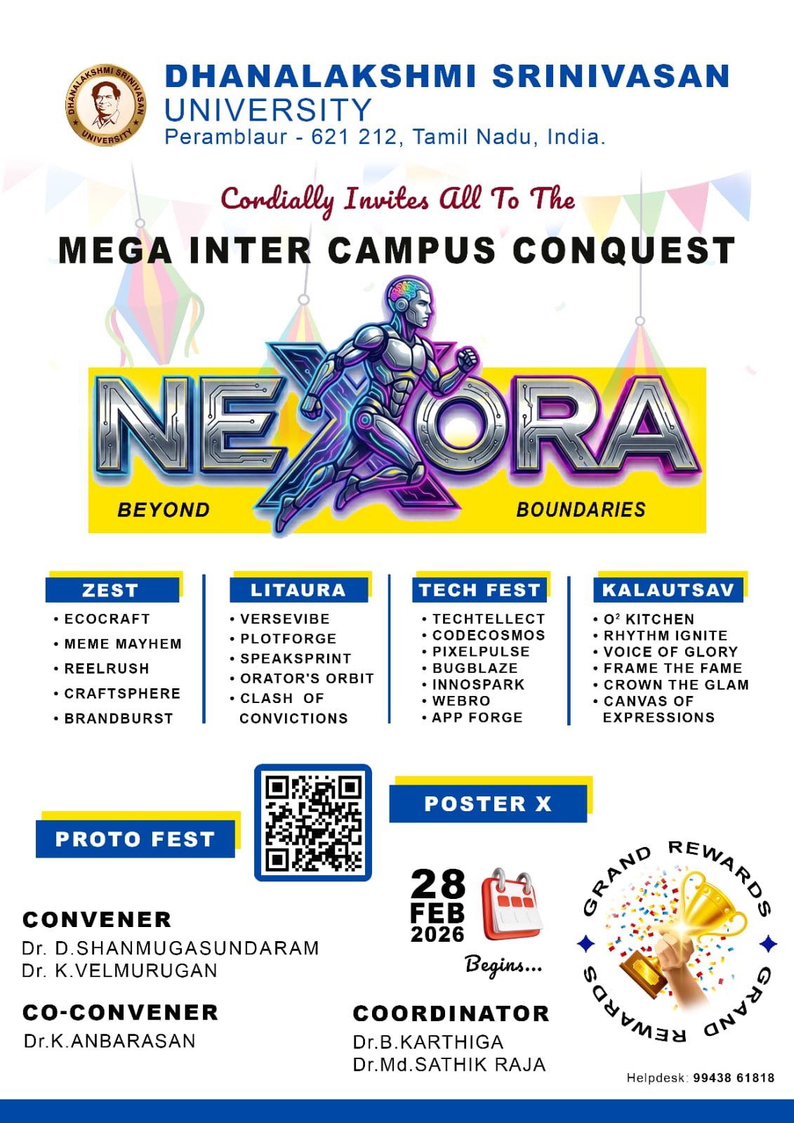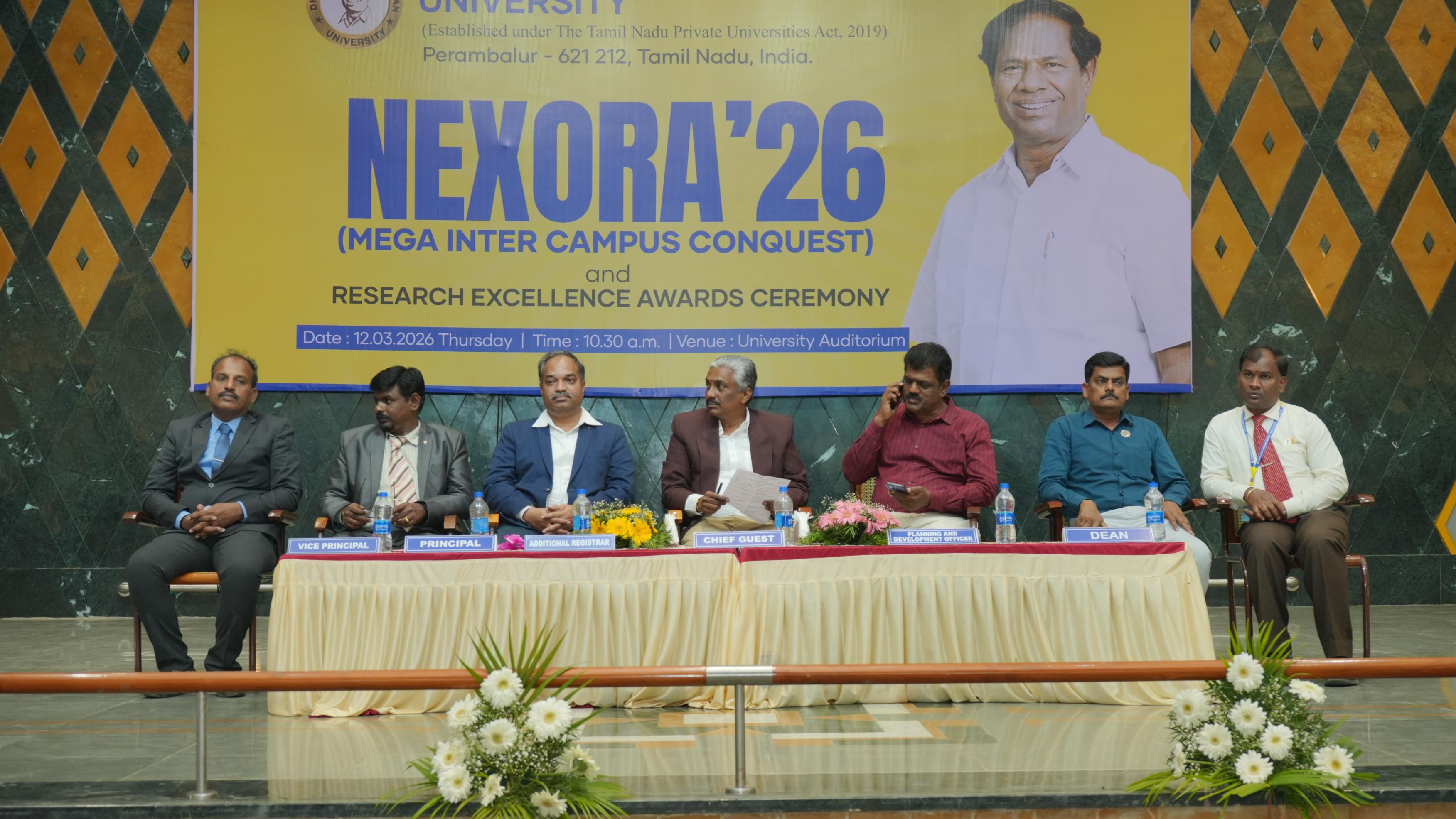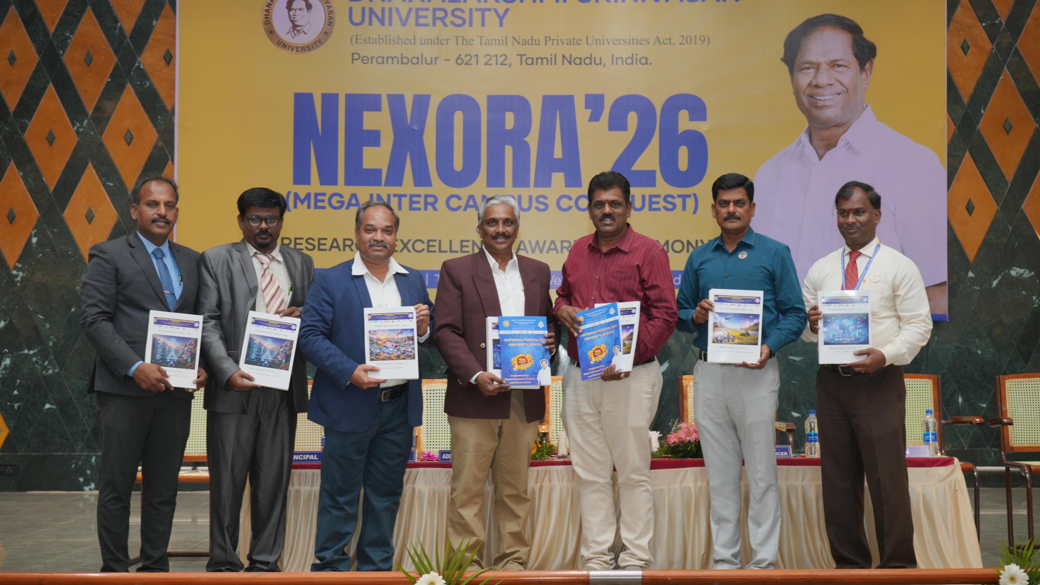 Helpline : +91 63841 76766 | 63841 76769The School of Engineering & Technology, Dhanalakshmi Srinivasan University, Perambalur, successfully organized “NEXORA – Beyond Boundaries” on 28th February 2026. The event aimed to bring together students from various institutions to showcase their talents, creativity, and technical skills through a vibrant inter-campus platform. The programme emphasized the importance of holistic development by encouraging students to participate in both cultural and technical activities. NEXORA featured a wide range of competitions under categories such as Zest, Litaura, Tech Fest, Kalautsav, and Proto Fest, covering areas like innovation, coding, arts, communication, and performance. The event witnessed active participation from students across different colleges, creating an energetic and competitive atmosphere. Participants demonstrated exceptional talent, teamwork, and creativity throughout the competitions. NEXORA 2026 concluded successfully with a prize distribution ceremony, recognizing outstanding performers and appreciating the efforts of all participants. The event truly reflected its theme, “Beyond Boundaries,” by inspiring students to explore their potential beyond academics.