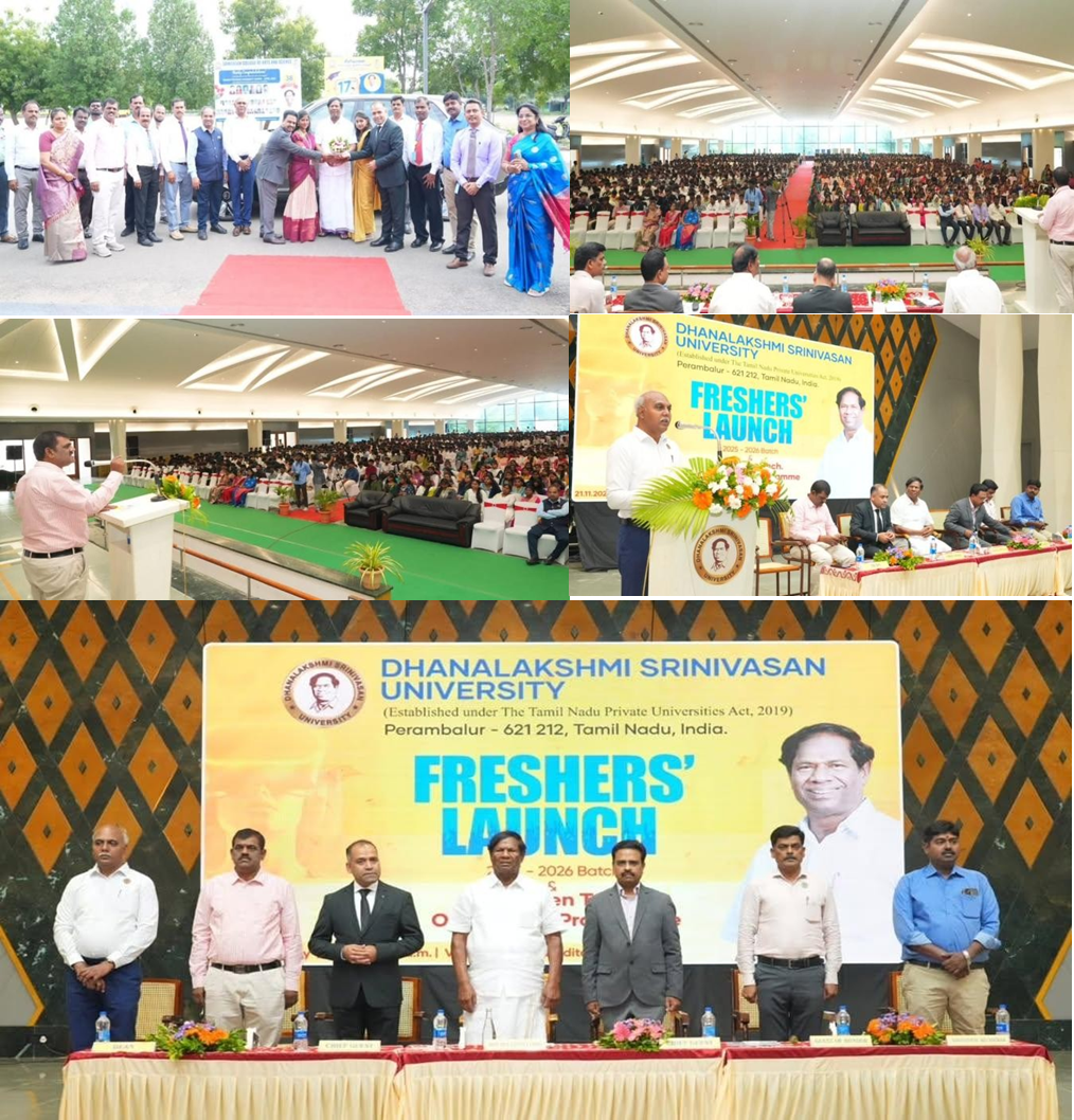 Helpline : +91 63841 76766 | 63841 76769Dhanalakshmi Srinivasan University proudly hosted the Freshers Launch and NextGen Tech Orientation Programme for the 2025-2026 batch, welcoming new students into the School of Engineering and Technology with energy and inspiration. Presided over by Shri. A. Srinivasan, Esteemed Chancellor, the event featured insightful sessions from distinguished chief guests Mr. Arshi Krishnachar, Vice President of Seoul Semiconductor Company Ltd., Bengaluru, and Mr. Ananth Jagannathan, Senior Director at Oracle Financial Services Software Limited, Chennai. Their guidance on emerging technologies, industry expectations, and future opportunities motivated students to embark confidently on their academic journey. The university community came together to celebrate fresh beginnings, innovation, and the promise of a bright future for every budding engineer.
