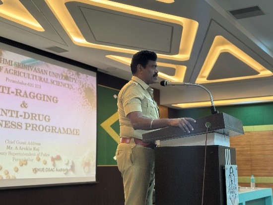 The School of Agricultural Sciences, Dhanalakshmi Srinivasan University, Perambalur, organized an Anti-Ragging Awareness Programme on 16.09.2025 at the university campus for the I Year, Bsc., (Hons.) 2025 Batch. The programme aimed to create awareness among freshers about the importance of maintaining a safe, respectful, and inclusive campus environment. Mr. A. Arokia Raj, DSP, Perambalur, graced the occasion as the Chief Guest and addressed the students on the legal provisions against ragging, university policies, and the strict disciplinary actions that would be taken in case of any violation. He highlighted the psychological and social impacts of ragging and encouraged students to build healthy peer relationships based on mutual respect and understanding. Faculty members and resource persons further elaborated on the mechanisms for reporting incidents and seeking support through interactive sessions. The awareness programme emphasized the universitys zero-tolerance policy towards ragging and motivated students to uphold values of friendship, harmony, and cooperation. This initiative helped freshers feel secure and confident as they began their academic journey in a positive and welcoming atmosphere.