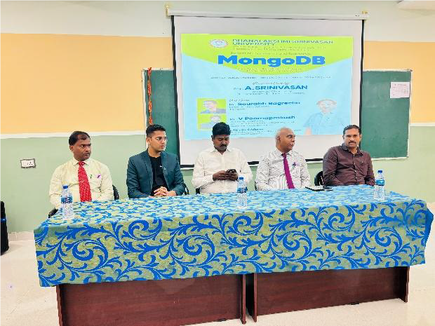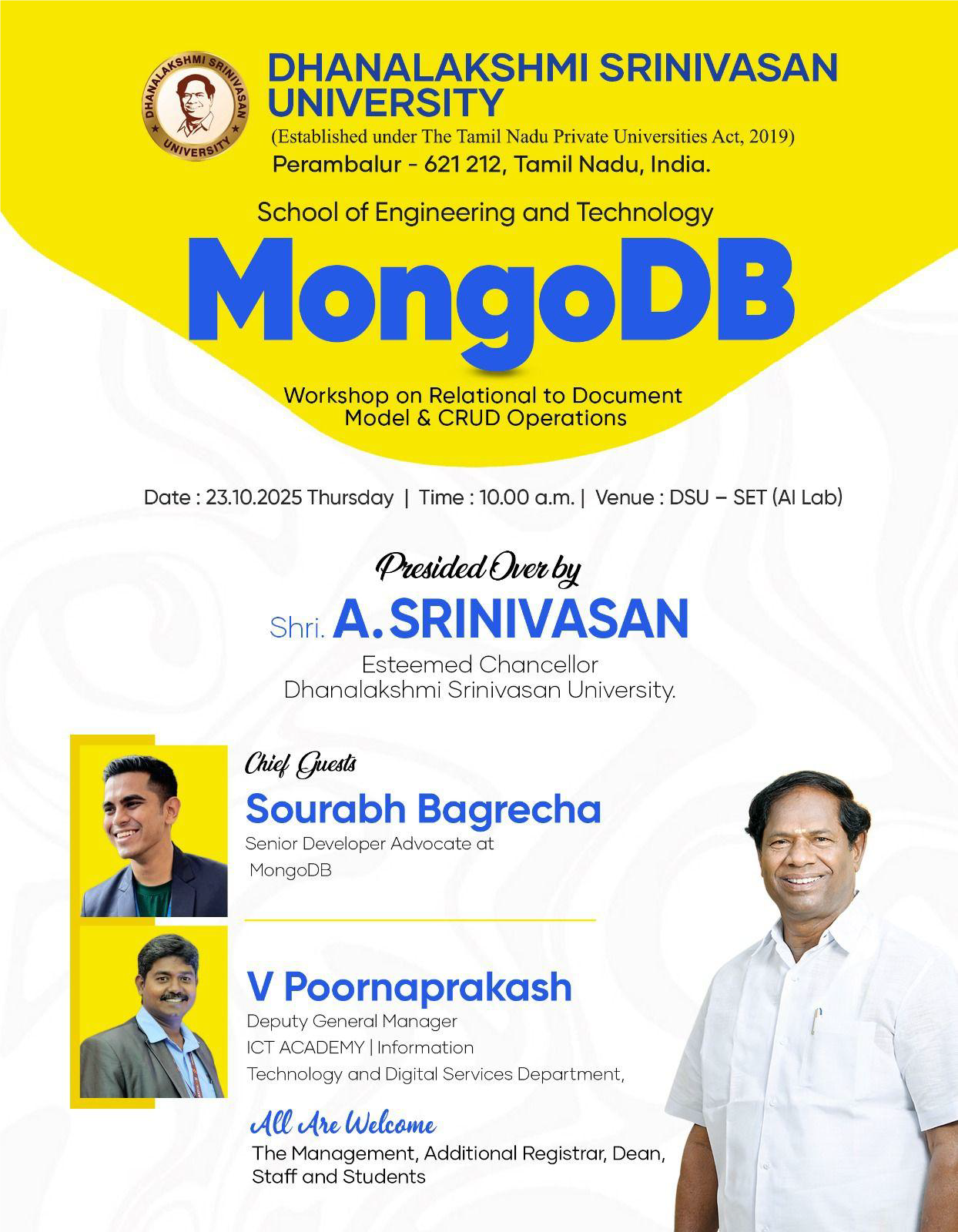 Dhanalakshmi Srinivasan University, School of Engineering and Technology, organized a Workshop on Relational to Document Model & CRUD Operations using MongoDB on 23rd October 2025 at the DSU - SET (AI Lab).The session was presided over by Shri. A. Srinivasan, Esteemed Chancellor of Dhanalakshmi Srinivasan University.The workshop featured insightful sessions by industry experts Mr. Sourabh Bagrecha, Senior Developer Advocate at MongoDB, and Mr. V. Poornaprakash, Deputy General Manager at ICT Academy, who shared their expertise on database management and document-oriented data models.This event provided students with valuable industry exposure and hands-on learning experience on MongoDB fundamentals and CRUD operations.