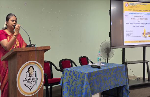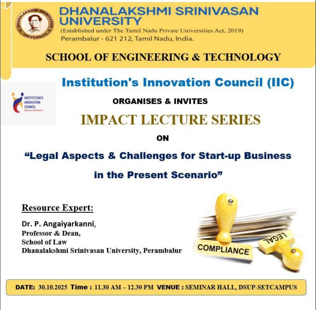 Dhanalakshmi Srinivasan University, School of Engineering & Technology, proudly organized an Impact Lecture Series under the Institutions Innovation Council (IIC) on the topic: Legal Aspects & Challenges for Start-up Business in the Present Scenario Resource Expert: Dr. P. Angaiyarkanni, Professor & Dean, School of Law, DSU, Perambalur Date: 30.10.2025 Time: 11:30 AM - 12:30 PM Venue: Seminar Hall, DSUP-SET Campus The session provided valuable insights into the legal framework and challenges faced by startups in the current business landscape, empowering students with practical knowledge to navigate the entrepreneurial world effectively.