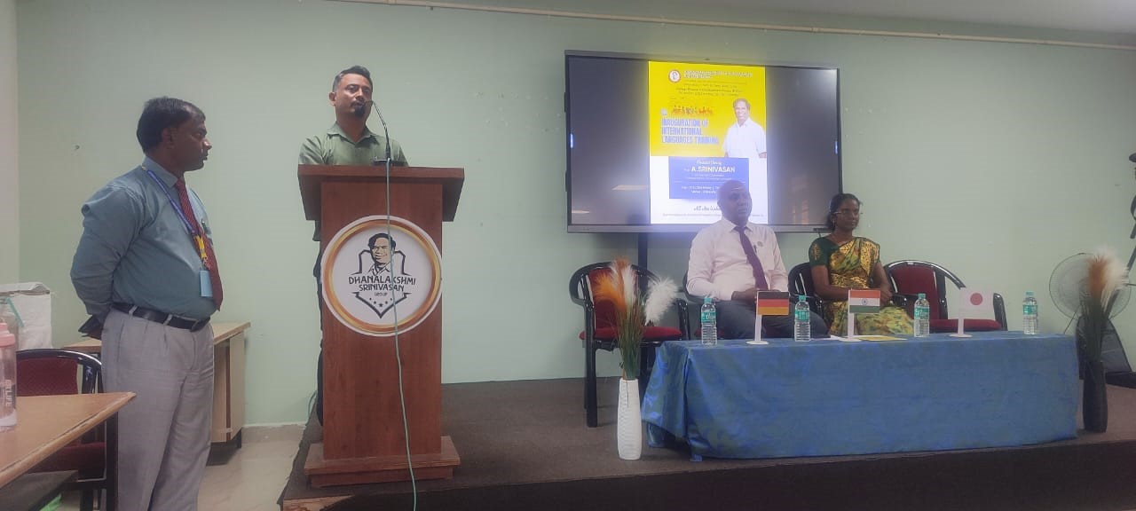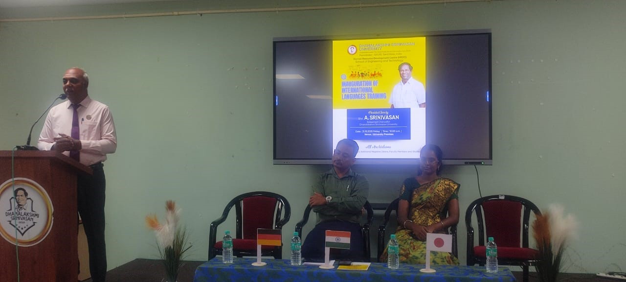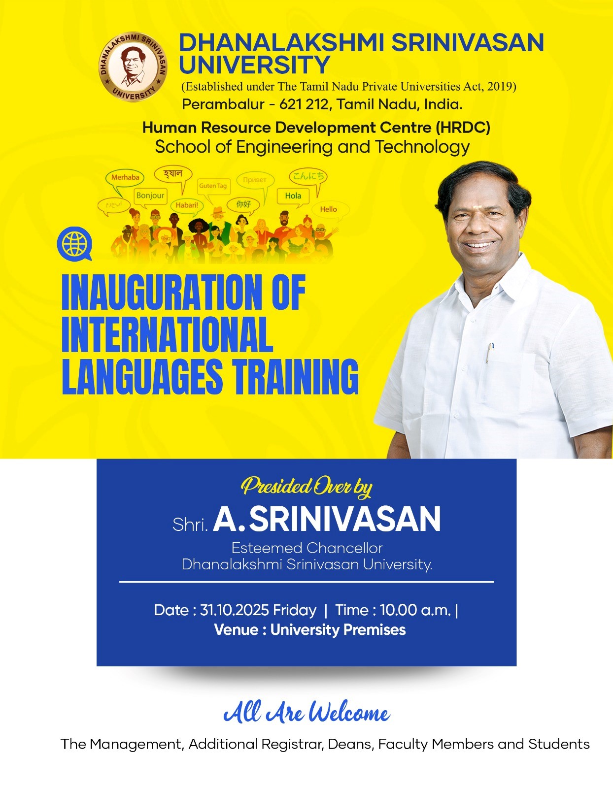Dhanalakshmi Srinivasan University, School of Engineering and Technology, proudly inaugurated the International Languages Training organized by the Human Resource Development Centre Dr.Shanmugasundaram (HRDC) on 31st October 2025 at the DSU Seminar Hall. The event was presided over by Shri.A.Srinivasan, Esteemed Chancellor of Dhanalakshmi Srinivasan University. The session featured eminent guests including Mr. Manivarman, Head,WB Institution, Avadi,Chennai. Ms. Aruna, Trainer - Japanese Language, and Ms. Asha, Trainer - German Language. The program aimed to empower students with global communication skills and cross-cultural knowledge.